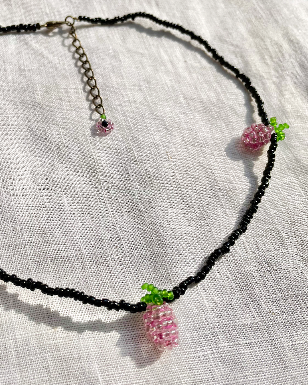 This charming handmade necklace features three delicate beaded raspberries, adding a sweet and summery touch to any outfit. Each berry is slightly different in size and shape, making every piece truly unique.